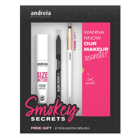 Este kit é composto por: 1 Máscara de pestanas Andreia Size Matters + 1 Eyeliner Andreia Black Velvet + 1 Pincel de sombras profissional