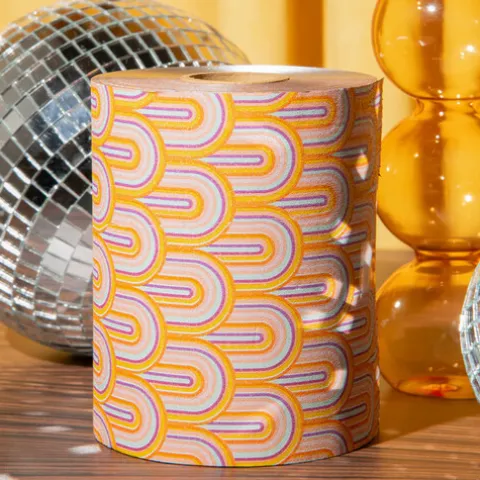 Rolo de papel alumínio estampado com um padrão de arco-íris retro! Uma reviravolta moderna nos já conhecidos e icónicos papéis de alumínio de arco-íris, num estilo vibrante e retro.