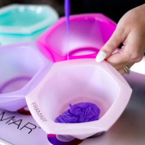 Um conjunto de várias taças para tinta de cabelo, que se encaixam em forma de favo de mel, permitindo usar várias cores enquanto as transporta de forma fácil.