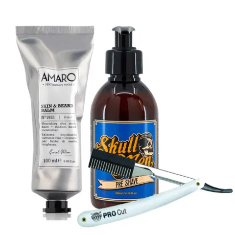 Este pack é composto por: Navalha Pro Cut + Skull Men Creme Pré-barbear (200ml) + Farmavita Amaro Bálsamo After-Shave Hidratante (100ml)