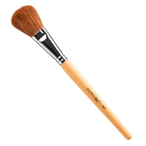 Um pincel profissional para aplicação de blush, com cerdas longas e macias, num formato de cúpula que difundem de forma uniforme os pigmentos em pó.