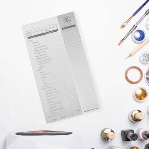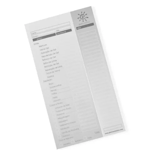 Este pequeno livro de registo de serviços prestados, inclui a descrição dos trabalhos realizados em unhas, depilação e estética, sendo igualmente útil para a gestão financeira do negócio, permitindo um controle mais eficiente das receitas e despesas.