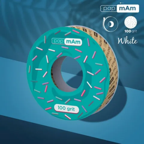 A papmAm EXPERT com 100 grit, é ideal para dar forma e comprimento a unhas artificiais. Com margens suaves feitas de papel artesanal, esta fita abrasiva protege a pele do cliente contra cortes acidentais, tornando o processo mais seguro e confortável.
