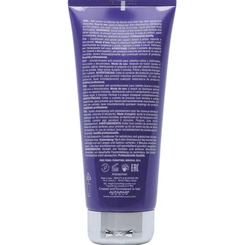 Este poderoso condicionador Anti-Yellow não apenas proporciona resultados eficazes, mas também se destaca pela sua fórmula vegan, fragrância de base biológica e textura colorida enriquecida com pigmento violeta azul.