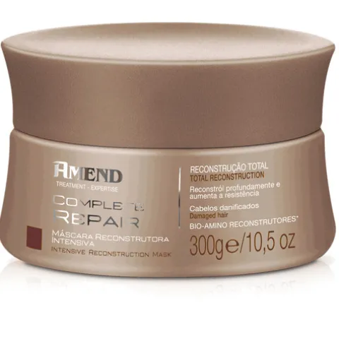 A Máscara Reconstrutora Amend Complete Repair age em profundidade na fibra capilar, reconstruindo e reparando os danos causados por processos químicos e agressões externas.