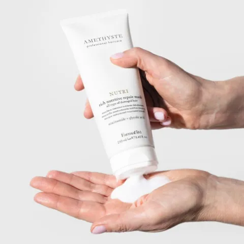 A fórmula da máscara nutritiva Amethyste combina a leveza com a eficácia, graças à presença de Niacinamida (Vitamina B3), que proporciona nutrição profunda sem comprometer a leveza dos fios. O cabelo ganha corpo, suavidade e resistência, sem perder movimento natural.