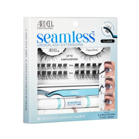 Inclui 36 Undies™ patenteadas e sem nós para uma mistura perfeita, cola preta e selante transparente profissional com duração de até 10 dias, removedor sem pingos e um aplicador de precisão.