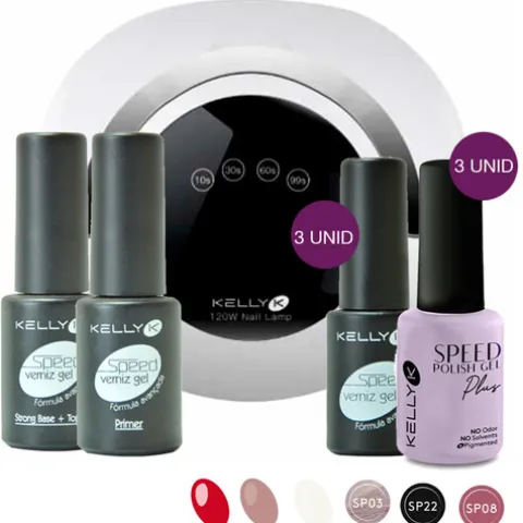 - 3 cores Kelly K Speed gel Plus (Cores incluídas: SP03, SP08, SP22)
