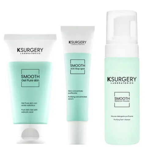 Este pack contém KSurgery Smooth SOS Stop Spot Serum 15 ml + KSurgery Smooth Balance Mousse de Limpeza 170 ml + KSurgery Smooth Gel Pure Skin com Ácido Salicílico 75 ml.