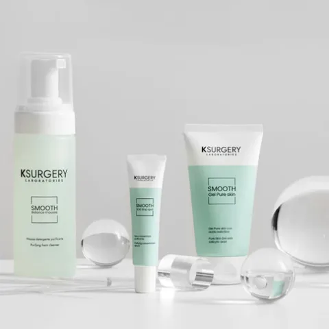 KSurgery Smooth Gel Pure Skin com Ácido Salicílico: A loção em gel de rápida absorção é especialmente formulada para peles com tendência acneica, excesso de sebo, comedões e poros dilatados. A sua fórmula contém ácido salicílico microencapsulado, que oferece uma tripla ação ao reduzir a produção de sebo, acelerar a cicatrização e prevenir processos inflamatórios que causam acne. A sua textura delicada torna-o adequado para peles com acne tardia, entre 30 e 60 anos.