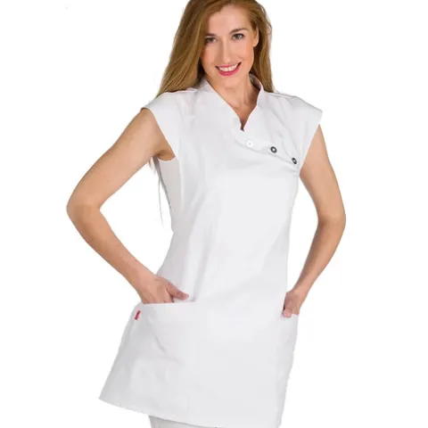 Túnica de cor branca com botões de metal sob pressão. Ideal para Cabeleireiros e Gabinetes de Estética.
