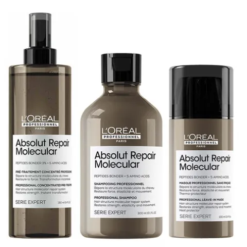 Kit composto por: L’Oréal Pro Absolut Repair Molecular Pré Tratamento 190 ml + L’Oréal Pro Absolut Repair Molecular Champô 300 ml + L’Oréal Pro Absolut Repair Molecular Máscara Leave In 100 ml.