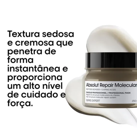 Modo de usar: Comece por lavar o cabelo com o L’Oréal Pro Serie Expert Absolut Repair Molecular shampoo, para melhores resultados. Com uma toalha, retire o excesso de água dos cabelos, deixando-os húmidos, mas não completamente molhados.