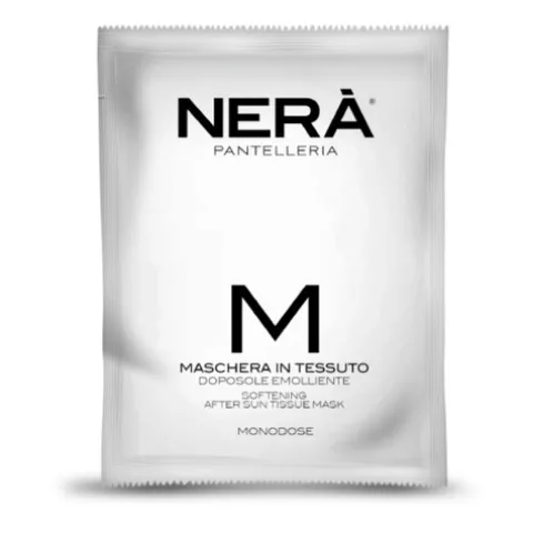 Uma máscara de tecido para o rosto embebida numa loção enriquecida com ativos que ajudam a acalmar e hidratar a pele após a exposição solar.