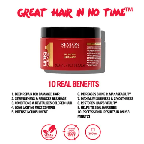 Com uma fórmula vegana de resultados profissionais instantâneos e dermatologicamente testada, esta máscara capilar de hidratação profunda que oferece os 10 benefícios que o fio necessita, para realçar a beleza natural de qualquer tipo de cabelo. Proporciona um cuidado intenso e uma suavidade duradoura.