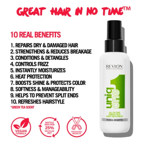 Agora com uma imagem completamente renovada, continua a manter o seu excelente desempenho. E como parte do compromisso da Revlon Profissional em reduzir o impacto ambiental, a sua nova embalagem apresenta um design mais atraente e sustentável com 25% de PET reciclado. UniqOne cuida, trata, protege, controla e não só. Repara os fios ressecados e danificados, visto que possui agentes hidratantes e de condicionamento que melhoram a textura e a sua maleabilidade.