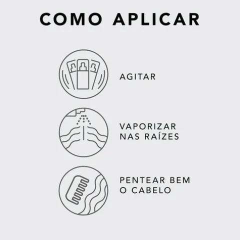 Modo de usar: Vaporizar com movimento nas raízes do cabelo seco e/ ou no resto do cabelo, escovar e pentear como desejar.
