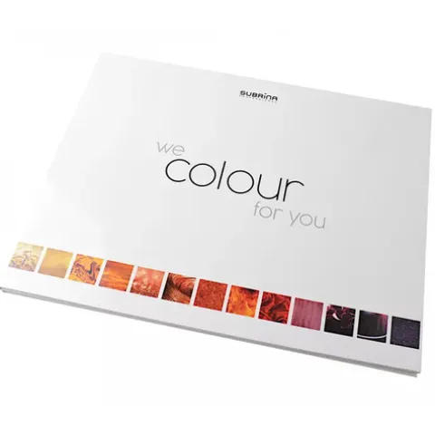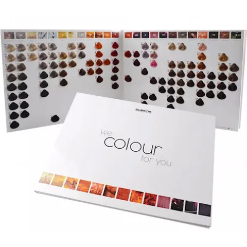 Um catálogo de cores de cabelo que oferece amostras das diferentes cores Subrina Professional Color e ainda inclui uma explicação sobre a teoria das cores e instruções de mistura e aplicação das cores apresentadas.