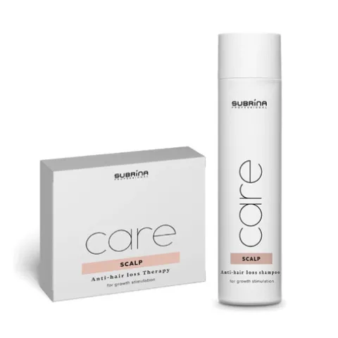 Este pack é composto por: 1 Subrina Professional Care Scalp Champô Antiqueda 250ml + 1 Subrina Professional Care Scalp Ampolas de Tratamento Antiqueda 5x10ml