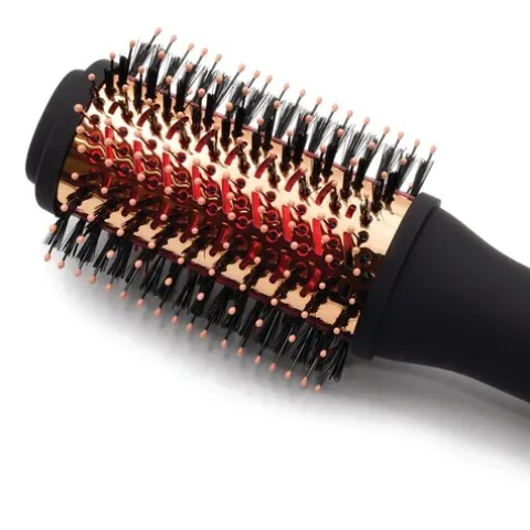 Tem um fluxo de ar de 360° que pode ser ajustado ao calor e à velocidade necessários para a criação do penteado. A sua função de ar frio com acabamento estilizado garante uma secagem duradoura com suavidade e volume aprimorados. Uma mistura de náilon premium e cerdas de javali desembaraçam, suavizam e realçam o brilho sem esforço, garantindo um acabamento liso e sem frizz.