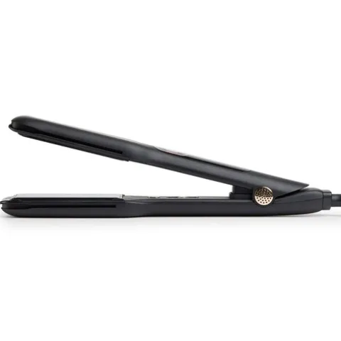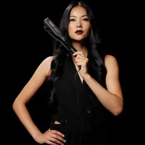 As suas placas de cerâmica e turmalina, com 38mm de largura, emitem iões negativos, eliminando o frizz e proporcionando brilho extra ao cabelo.