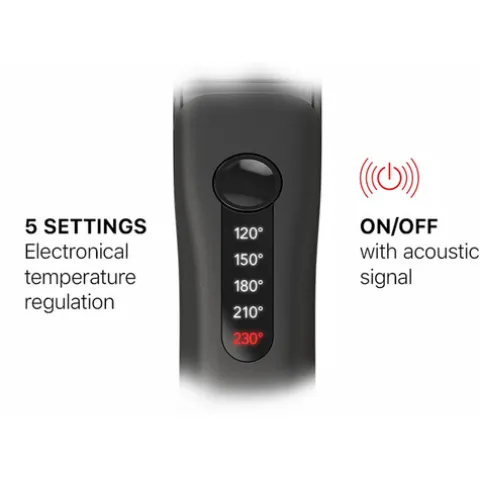 - Controlo de temperatura digital com 5 configurações (120º – 230º)